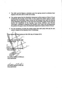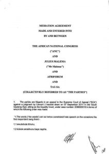 This settlement reached “in the interests of promoting reconciliation and to avoid inter-community friction” commits the ANC and its expelled youth league president Julius Malema to “counseling and encouraging their respective leadership and supporters to act with restraint to avoid the experience of such hurt that may be caused by “the lyrics of certain songs”.
