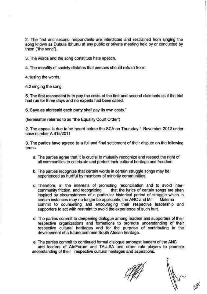 This settlement reached “in the interests of promoting reconciliation and to avoid inter-community friction” commits the ANC and its expelled youth league president Julius Malema to “counseling and encouraging their respective leadership and supporters to act with restraint to avoid the experience of such hurt that may be caused by “the lyrics of certain songs”.