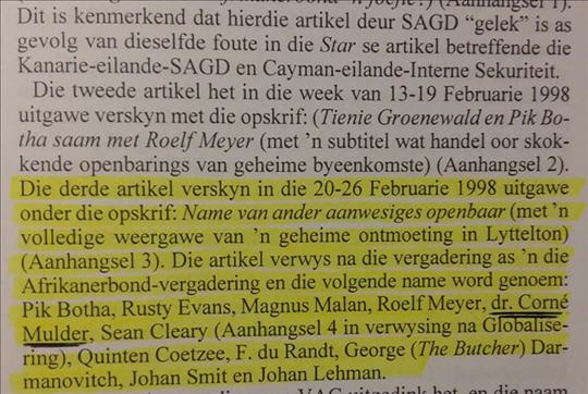 ‘n Saak wat egter op hierdie oomblik baie aandag skep, is die skermskoot van ‘n artikel wat in die hande van die skrywer beland het, wat daarop wys dat dr Corné Mulder van die VF Plus, ook saam met die Afrikaner Broederbond in gesprek was rondom sekere politieke sake. In die skrywer se strewe om feitlike inligting bekend te maak en om die korrektheid van die inligting te kan staaf, het ek hierdie plasing op Facebook gemaak waarin ek vra of iemand meer lig kan werp op watter forum of artikel die skermskoot van gemaak is. Dit het egter nou al vir ‘n paar dae geen verdere inligting beskikbaar laat raak nie.